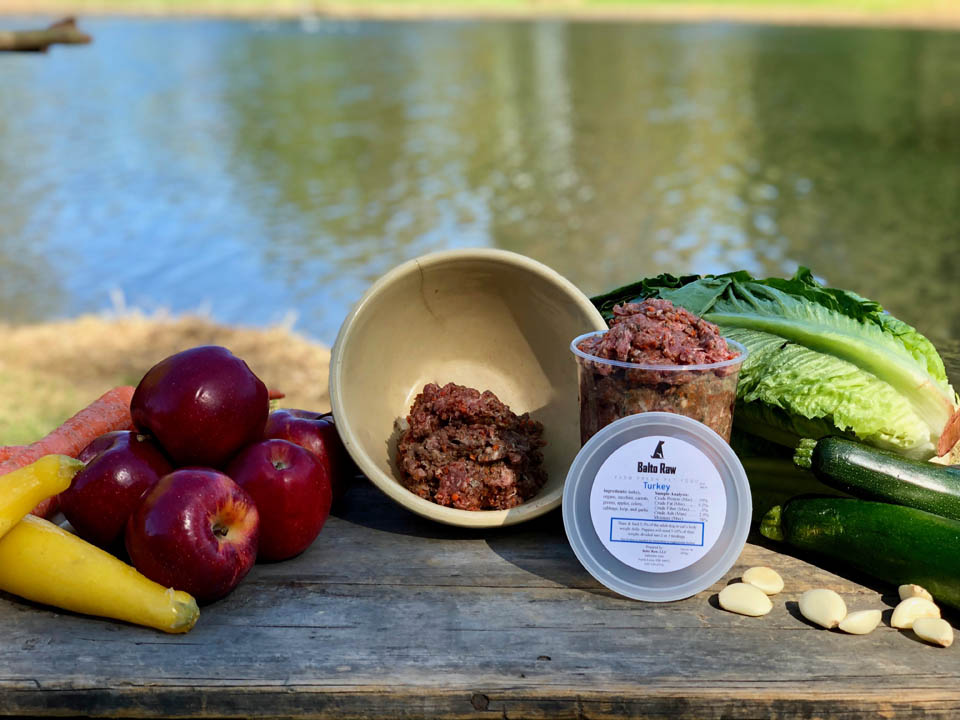 Whole ground turkey, organs, zucchini, carrots, squash, cabbage, green beans, broccoli, greens, apples, garlic. Turkeys are pasture raised here at Balto Raw Farms and are antibiotic free.